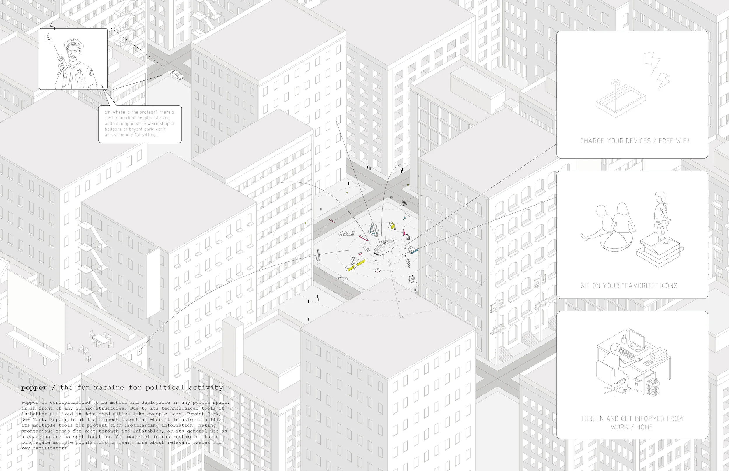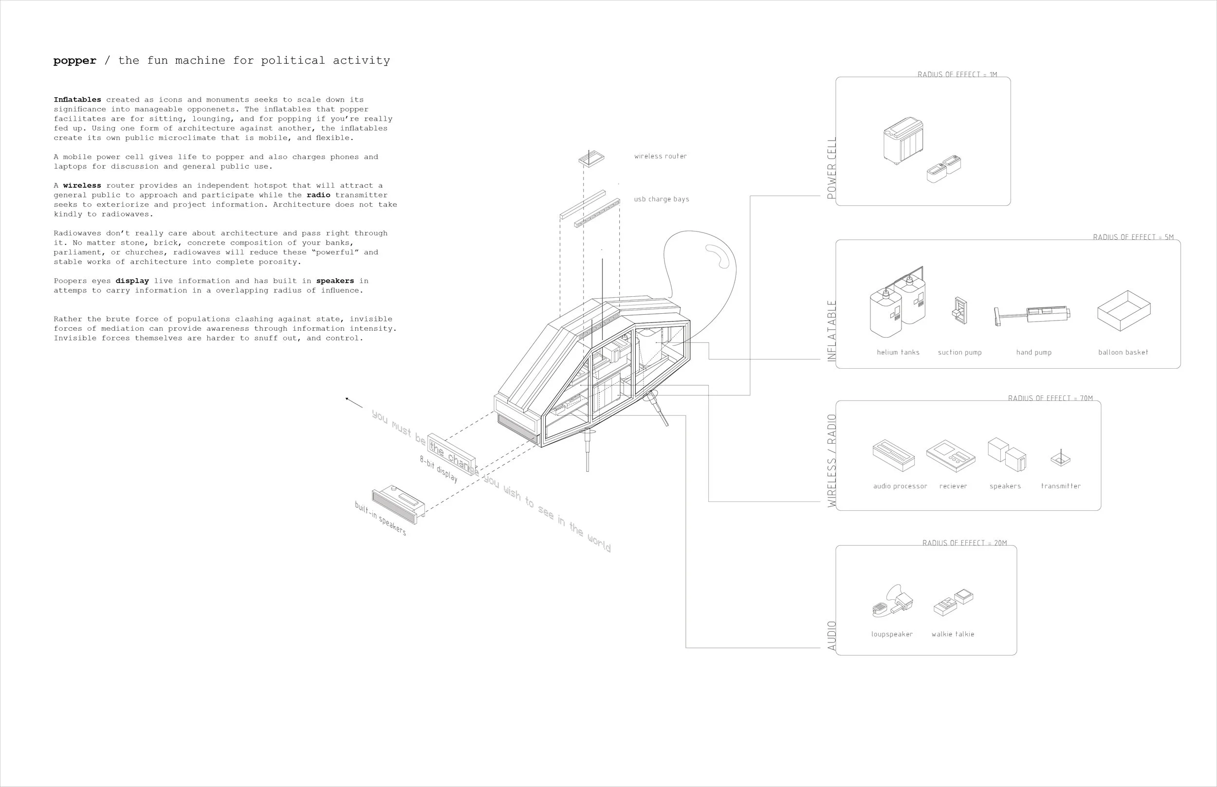 Popper is a machine in support of non-violent revolution. Popper is inspired by the preachings and actions of Gandhi that seeks to utilize architecture and technological media against the big boy monuments and icons of economy, institution, and government.